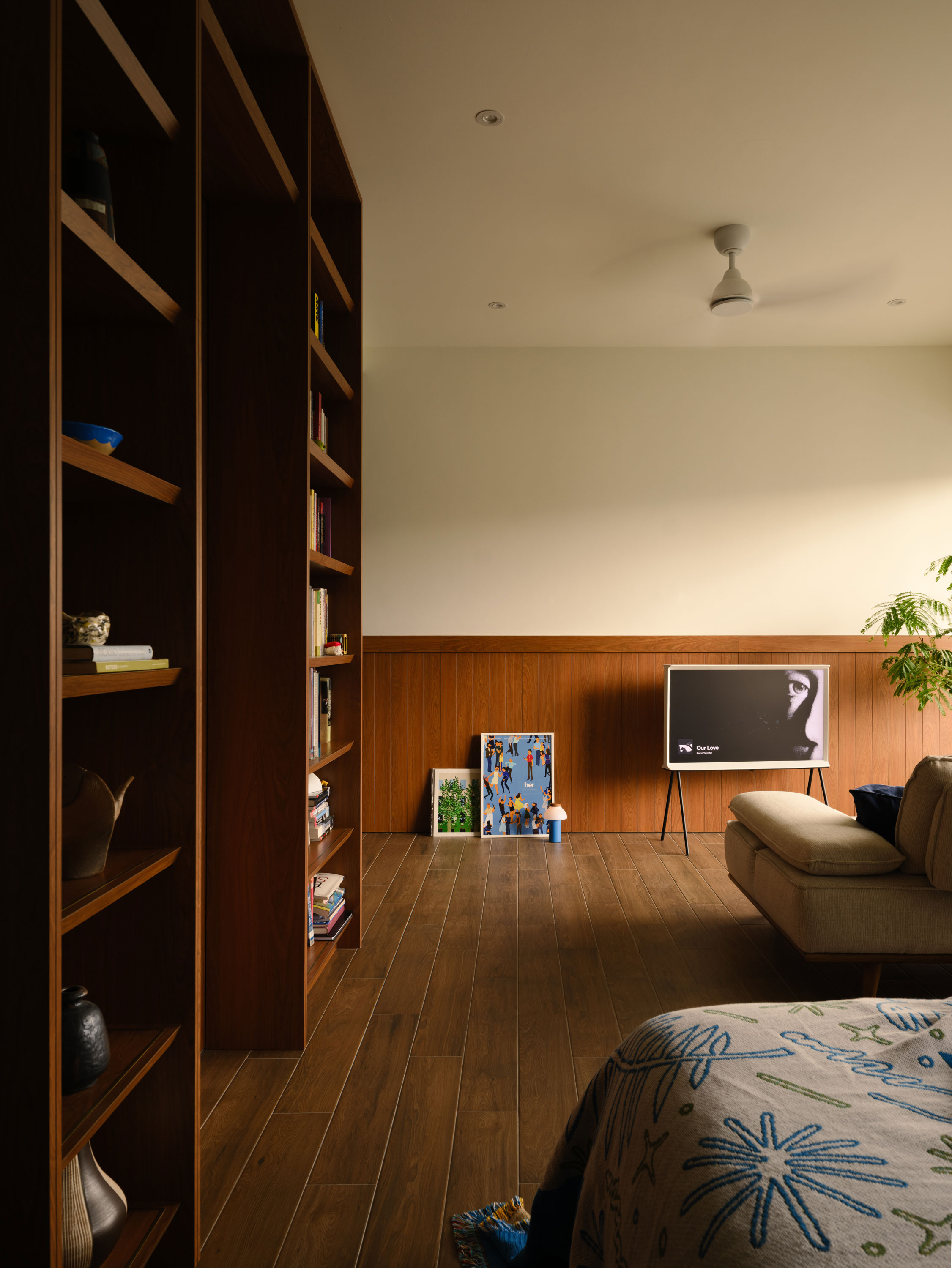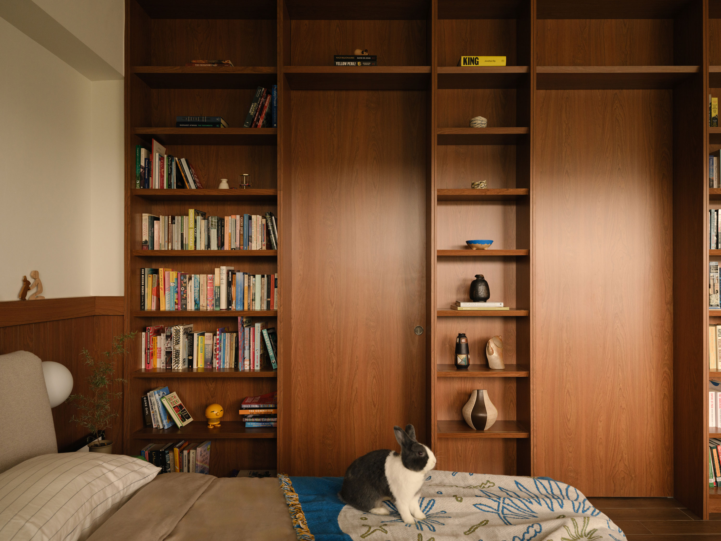 At the heart of the space stands a full-height bookshelf, an impressive feature that combines form and function. Not just a storage solution, this bookshelf is a focal point that showcases your literary treasures and personal mementos. Its design includes two cleverly concealed doors, adding a touch of mystery and intrigue.