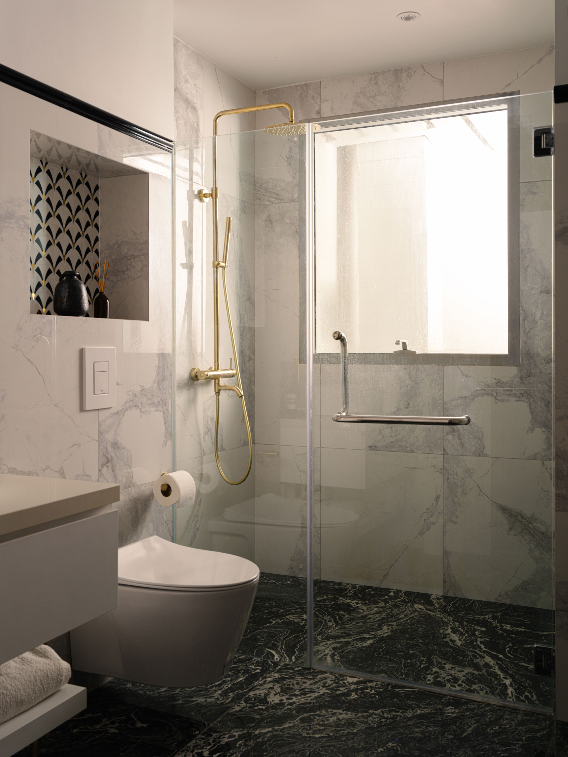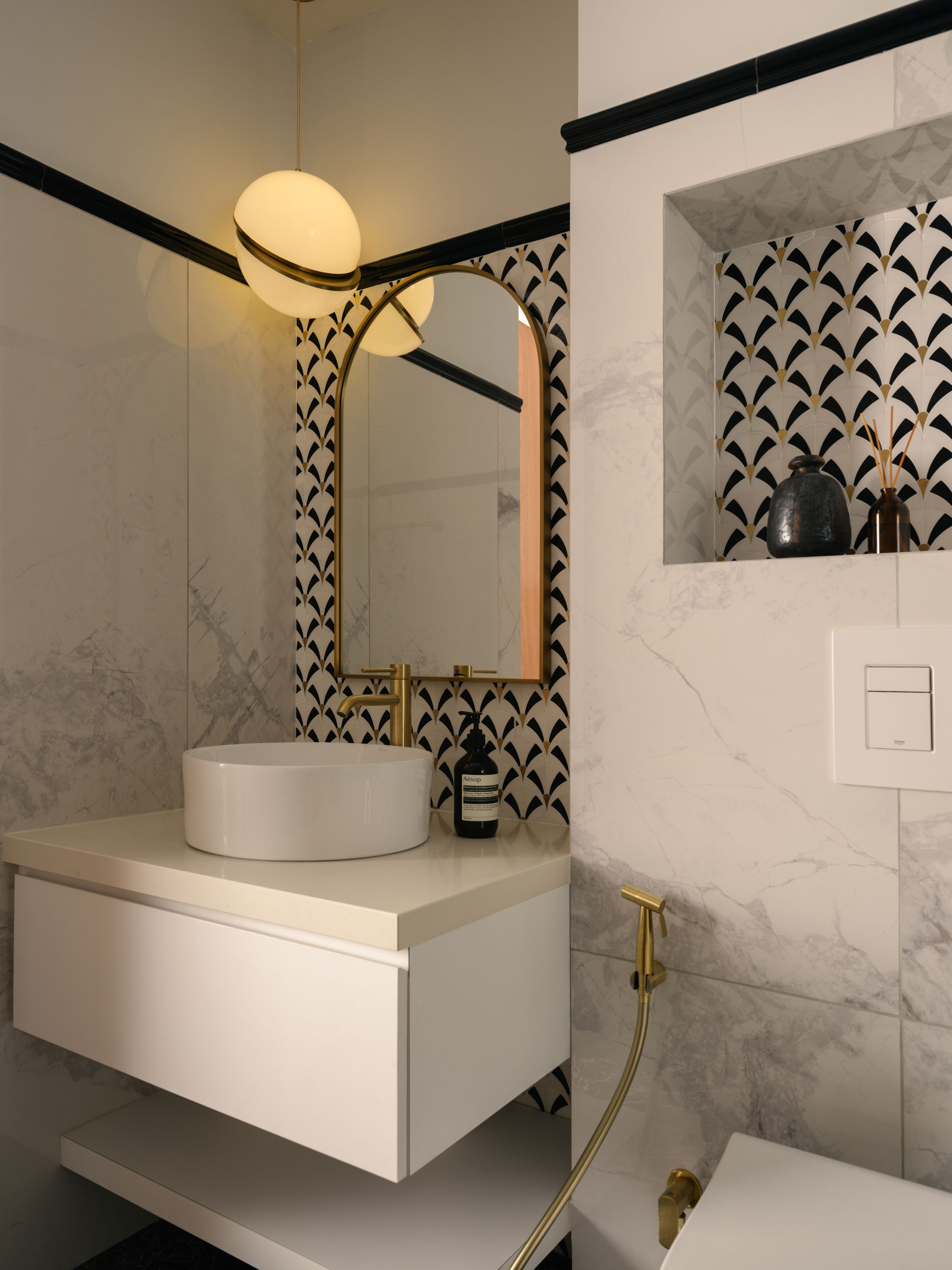 Inspired by the opulence of the Art Deco era, the bathroom is a luxurious retreat. With geometric patterns, bold contrasts, and elegant fixtures, this space adds a layer of sophistication and charm to the overall design. Every element, from the lighting to the tilework, has been carefully chosen to evoke the glamour and refinement of the 1920s.