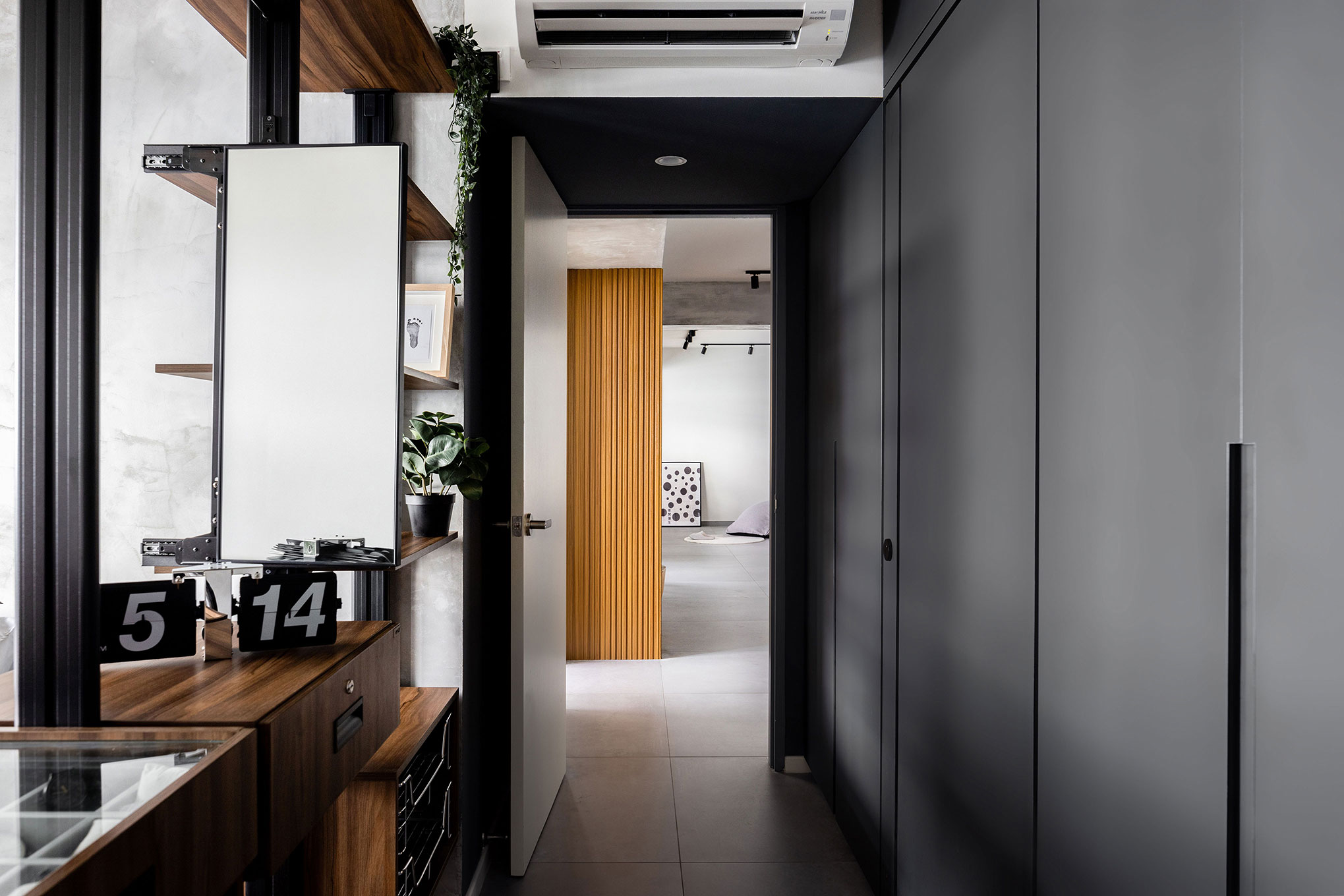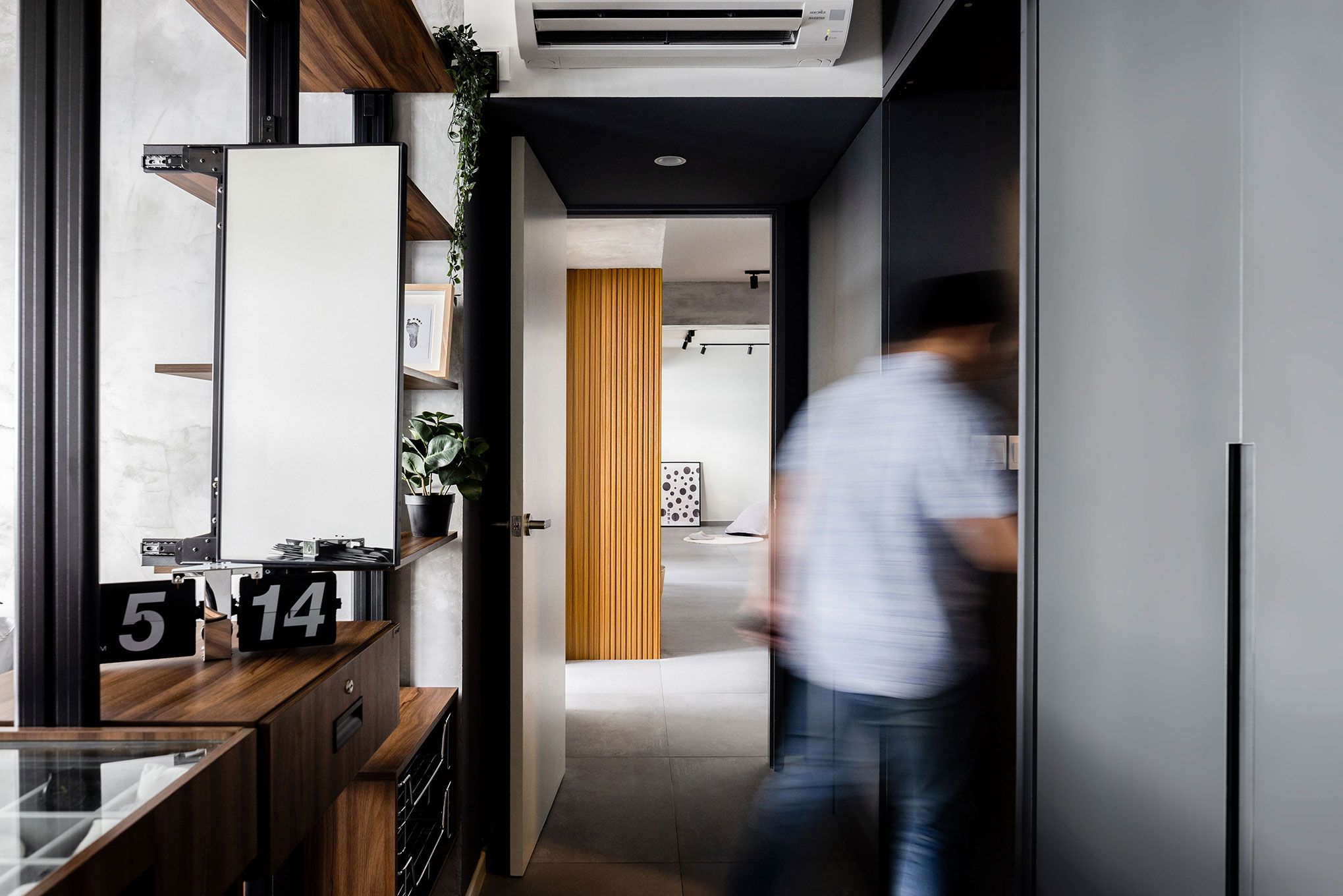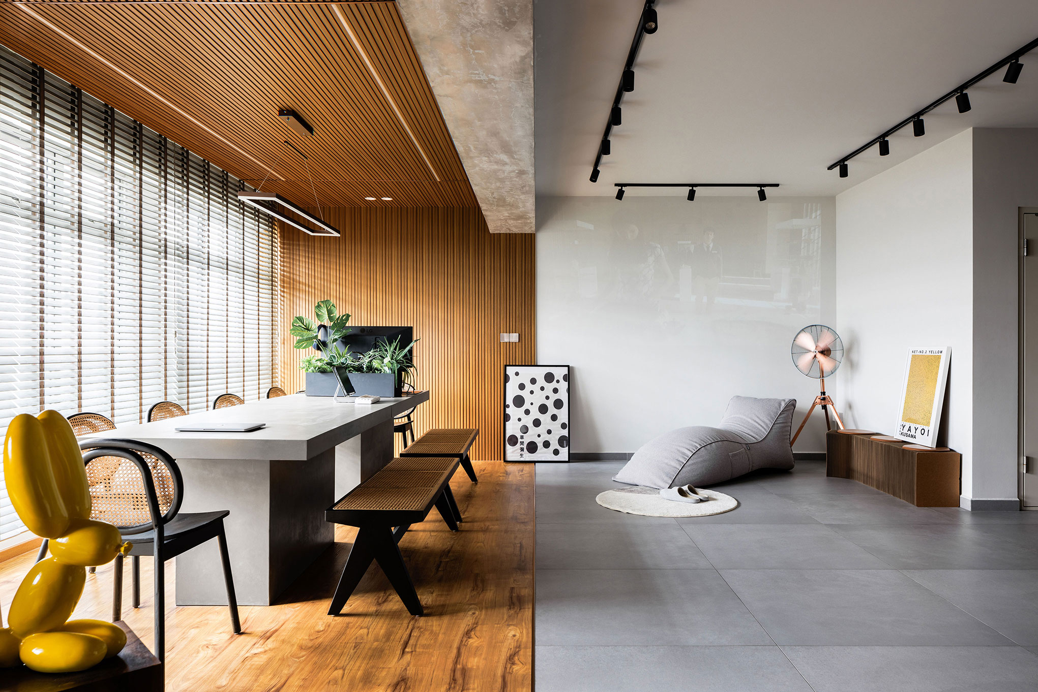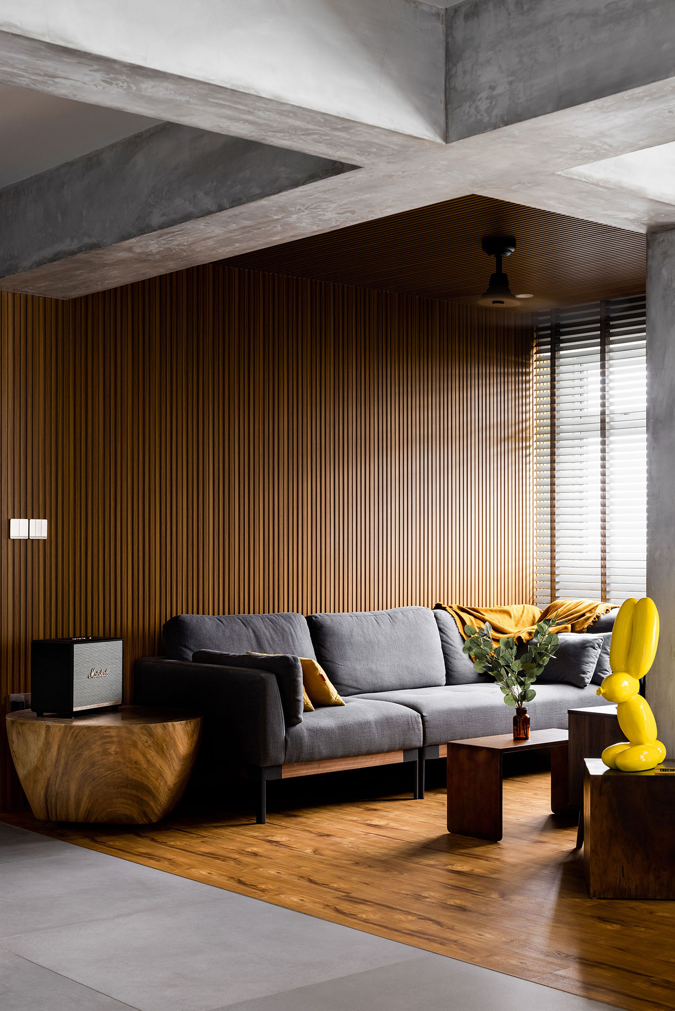 The thoughtful use of different floor finishes effectively segregates the space, enhancing both its functionality and visual appeal. The living area features a warm wooden vinyl floor finish; with matching fluted panels for the walls & ceilings that further envelope the space. This choice creates a cozy, inviting atmosphere, perfect for relaxation and social gatherings.