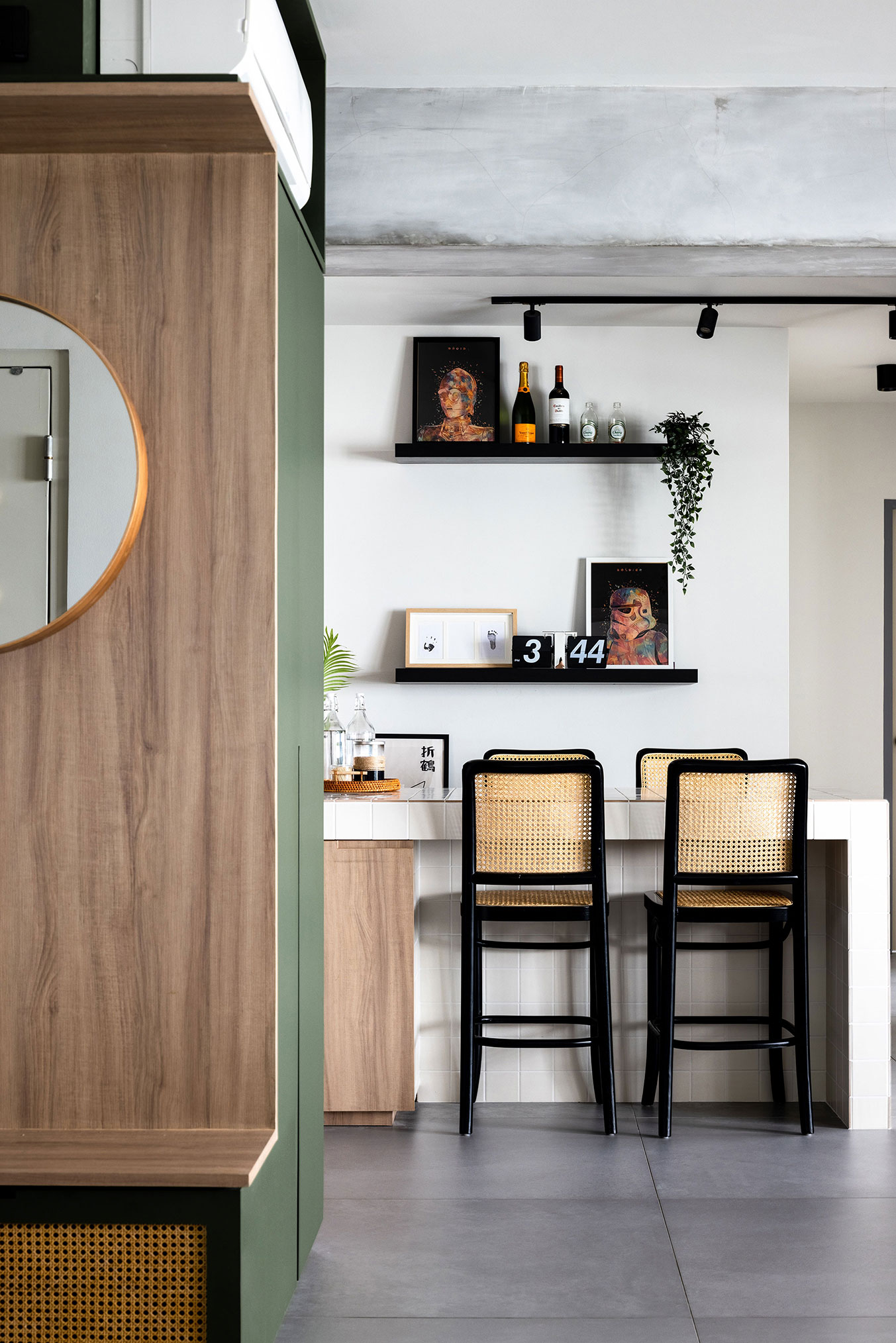 This contemporary space is a testament to the art of blending diverse styles. The combination of industrial, modern, and retro elements results in a living environment that is as versatile as it is visually stunning. From the exposed cement screed beam to the dirty green kitchen cabinets and the contrasting floor finishes, every detail has been carefully curated to create a home that is both stylish and practical.