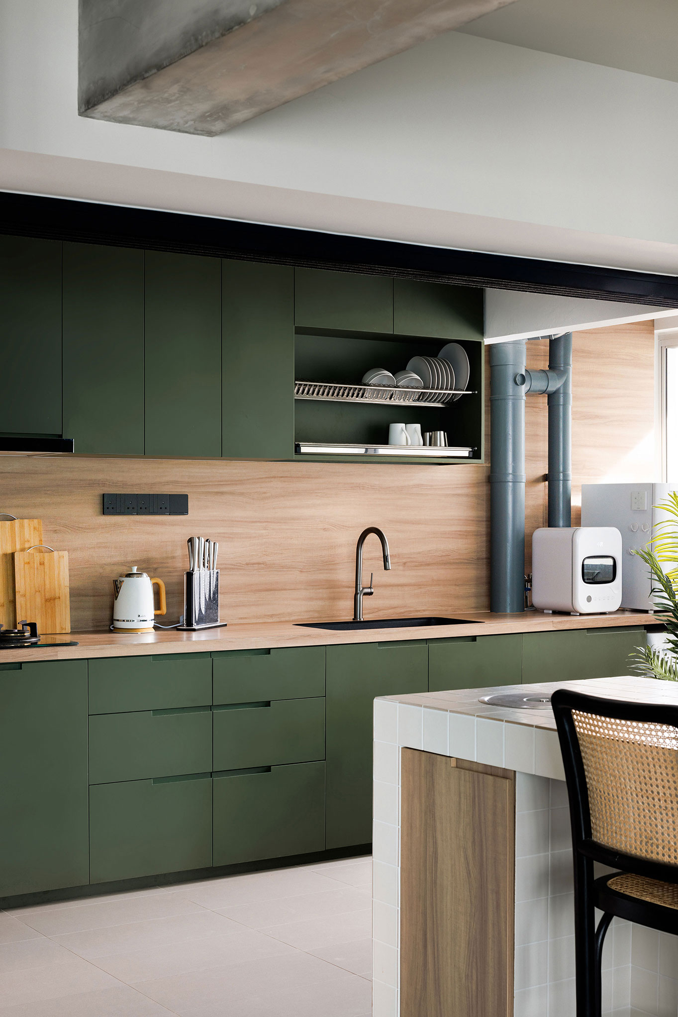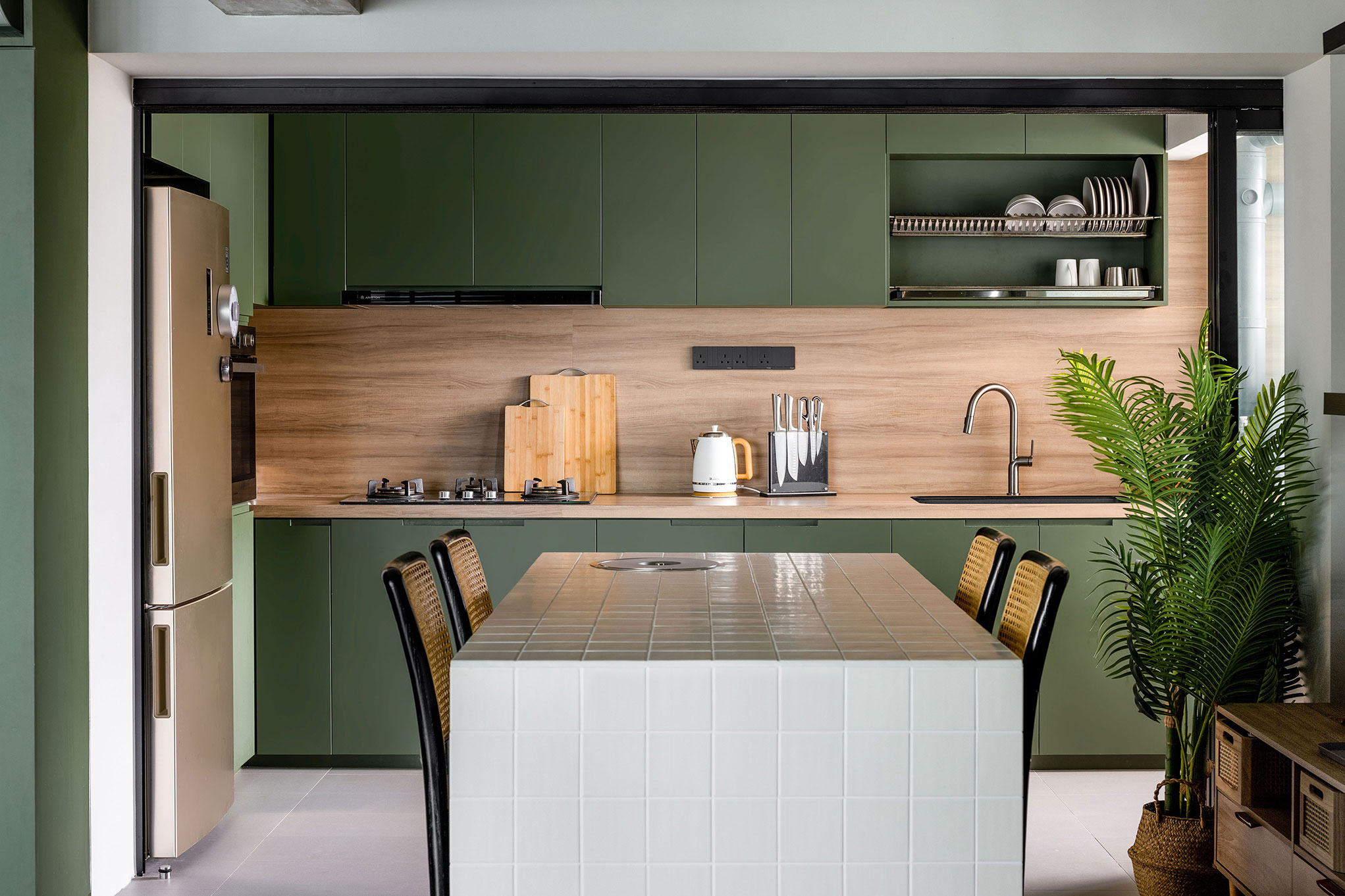 The kitchen area boasts a captivating mix of modern and retro influences. The small format tiled island serves as both a functional workspace and a stylish focal point. Complementing this is the distinctive dirty green cabinetry, a nod to retro aesthetics that brings a pop of color and personality to the space.