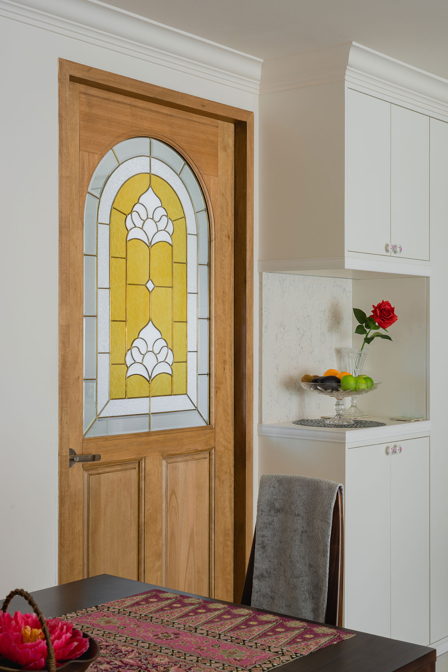 Stained glass is used thoughtfully to add vibrant pops of color and artistic flair. The kitchen door, adorned with stained glass, becomes a focal point, while a small display shelf with stained glass accents showcases cherished items, enhancing the home’s unique character.