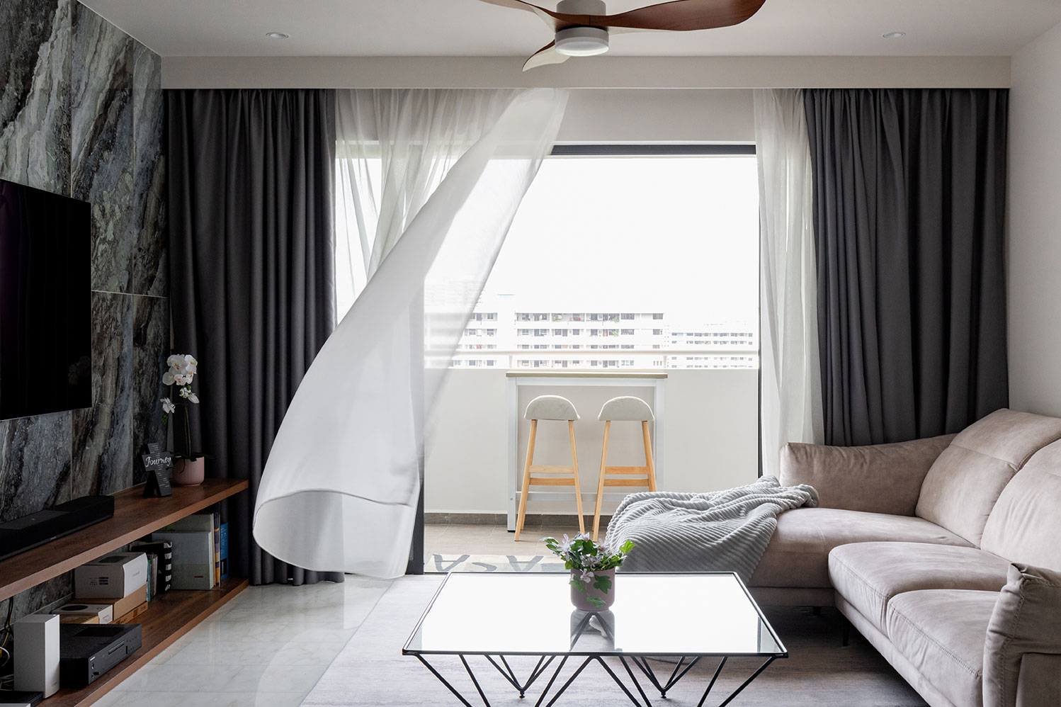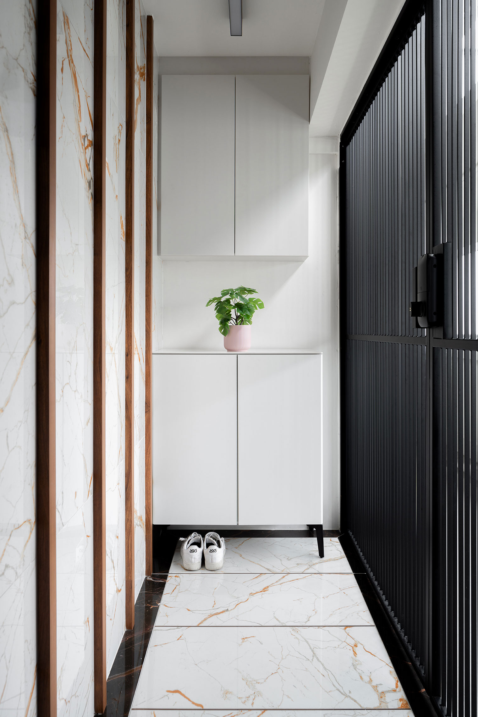 Step into a world of sleek sophistication and timeless elegance with our modern contemporary interior space. The foundation of this stunning design is the white-based marble floor, exuding luxury and refinement with its pristine surface. This sets the stage for the striking feature wall, adorned with strong marble veins that serve as a captivating focal point, seamlessly blending beauty and strength.