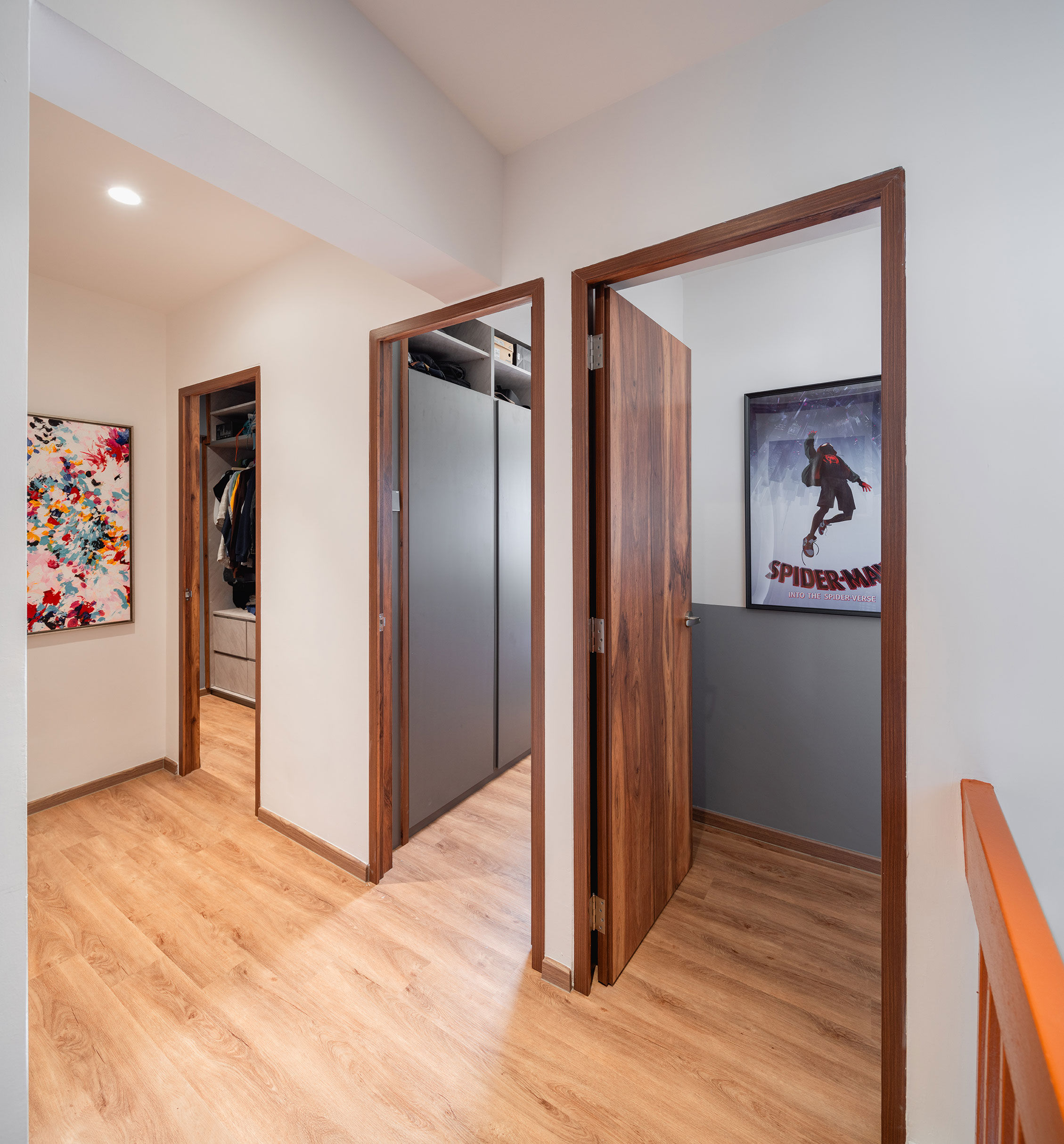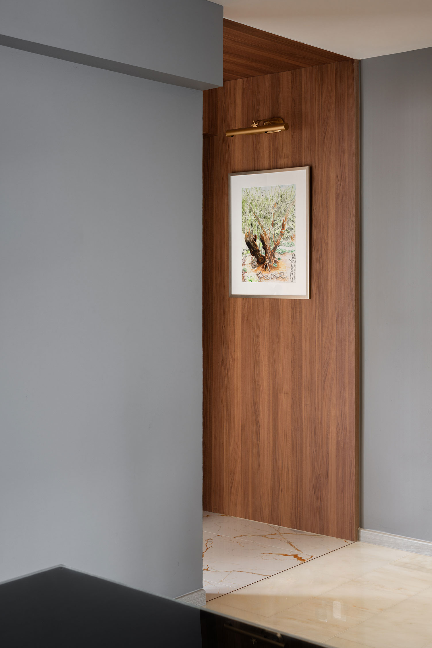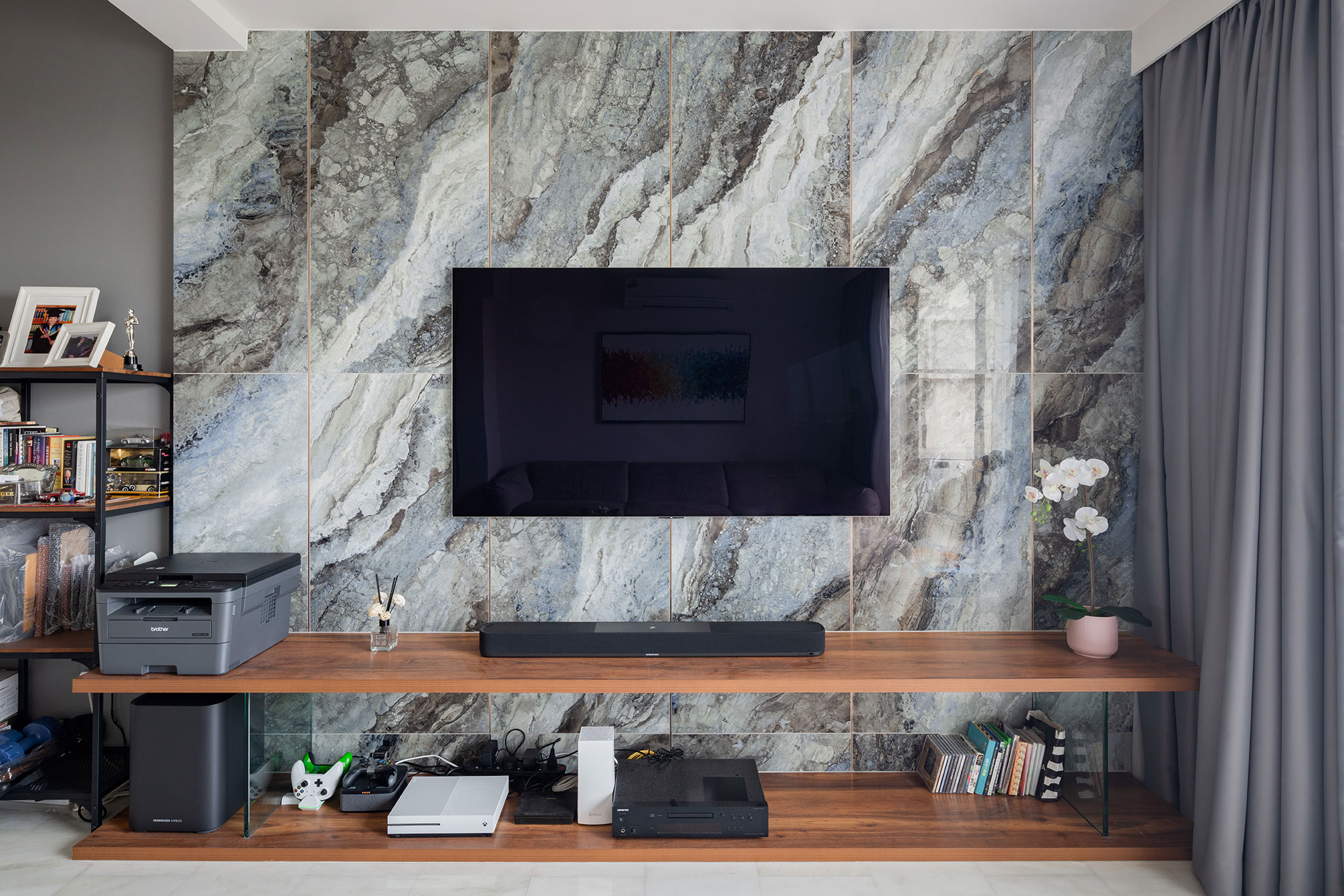 The space is thoughtfully accented with walnut shelves, adding warmth and a touch of nature’s richness. These shelves offer both functionality and an aesthetic appeal, creating an inviting atmosphere that feels both modern and cozy.