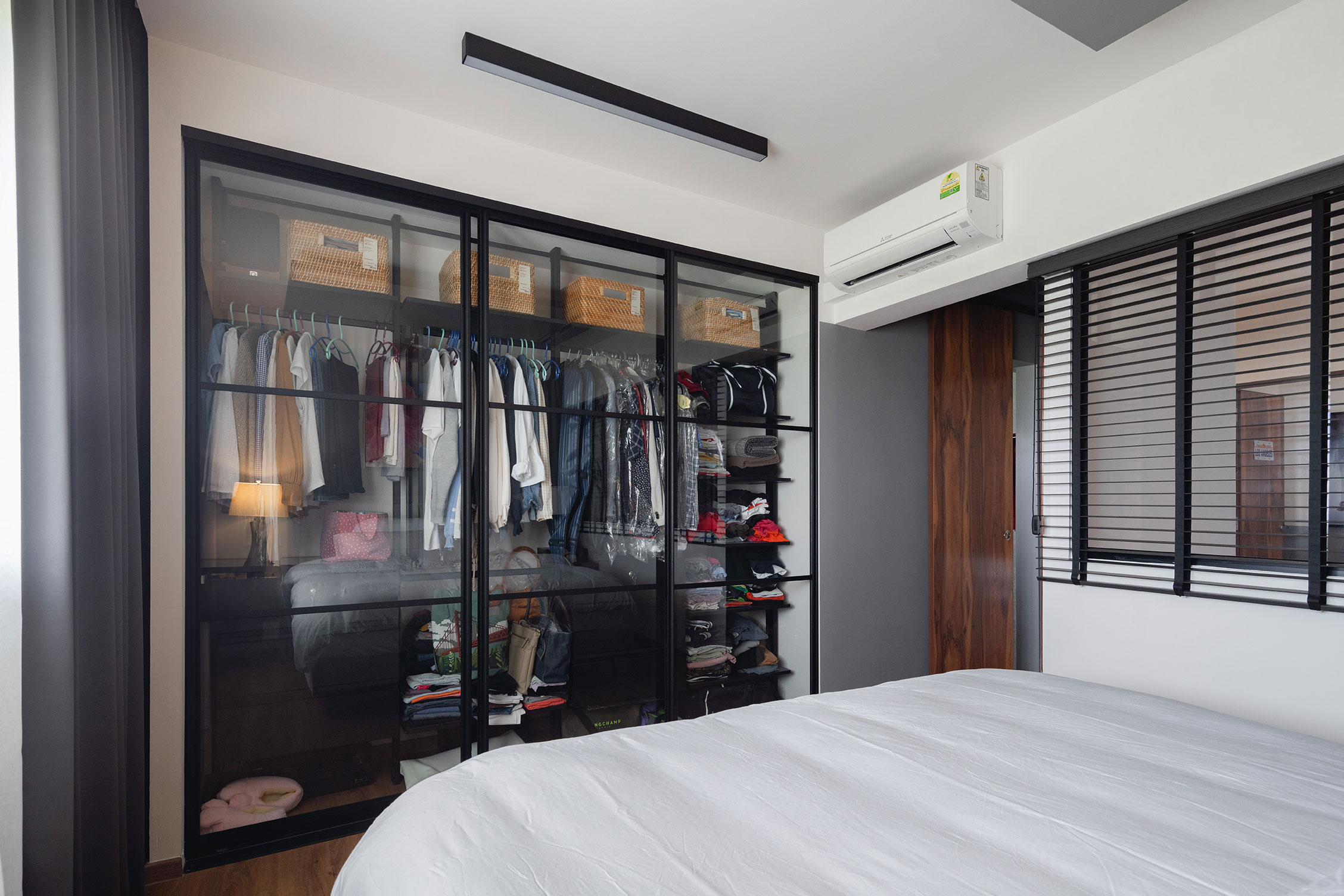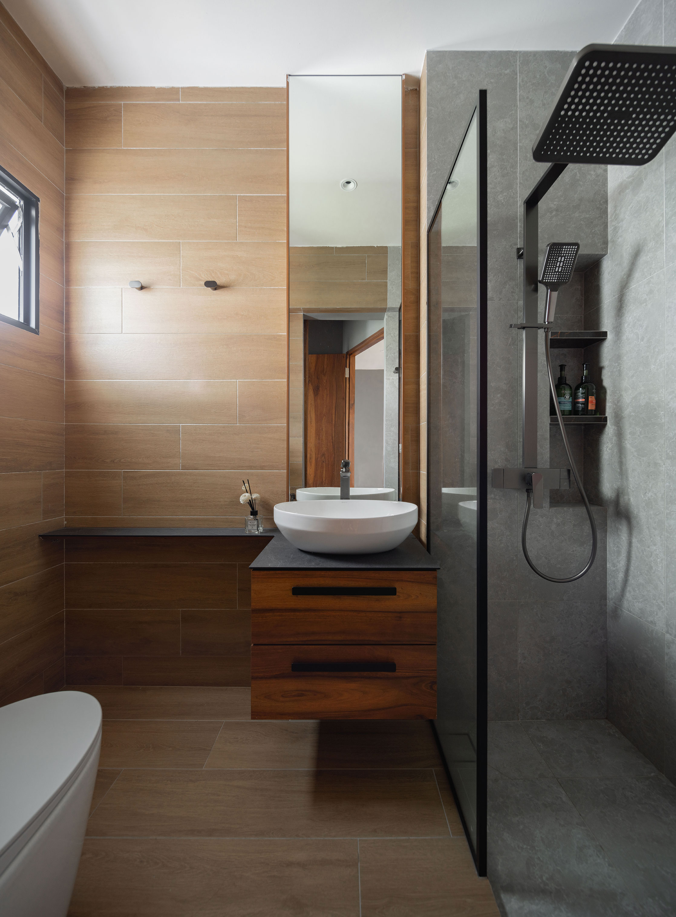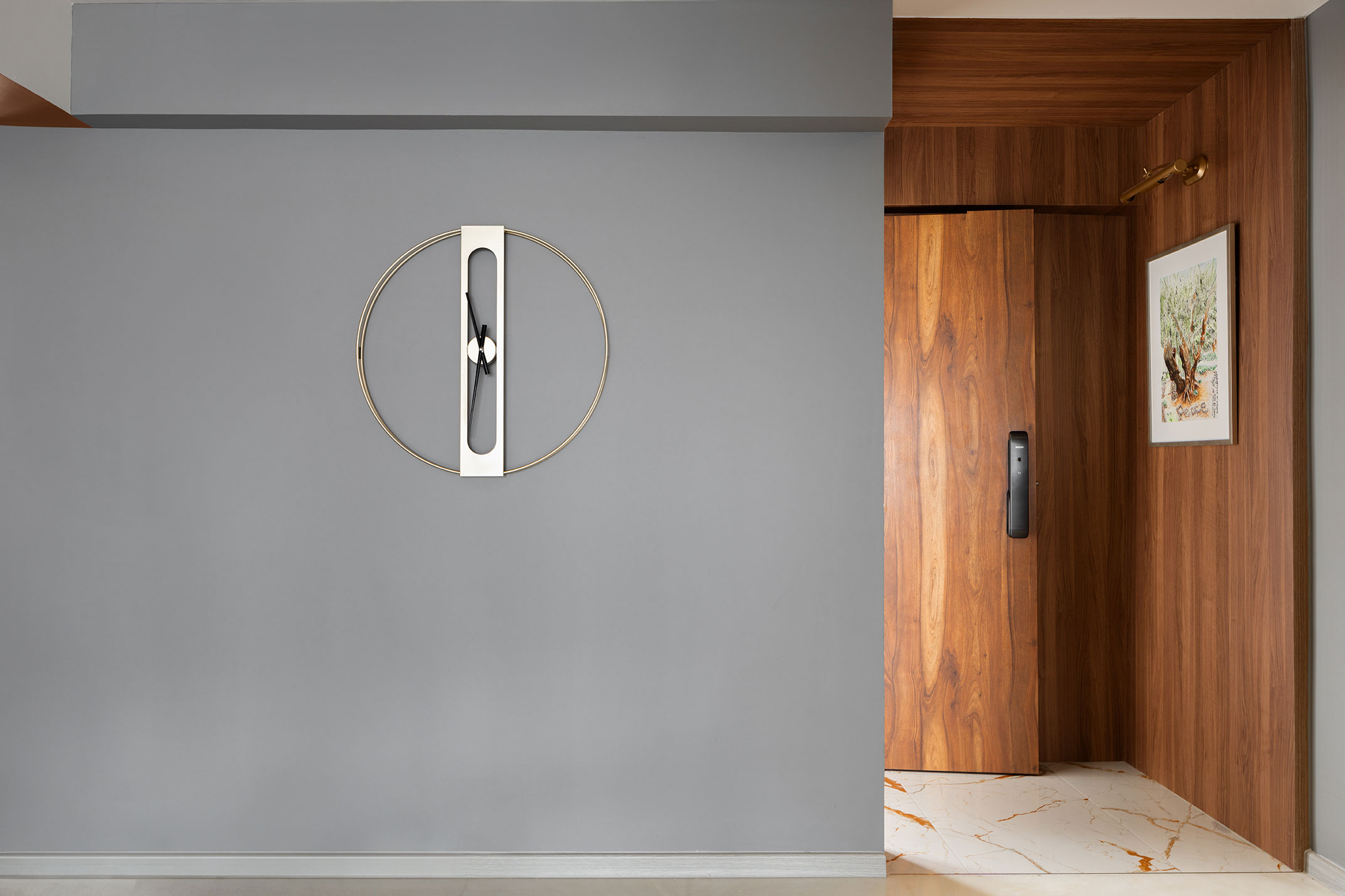 The space is thoughtfully accented with walnut shelves, adding warmth and a touch of nature’s richness. These shelves offer both functionality and an aesthetic appeal, creating an inviting atmosphere that feels both modern and cozy.