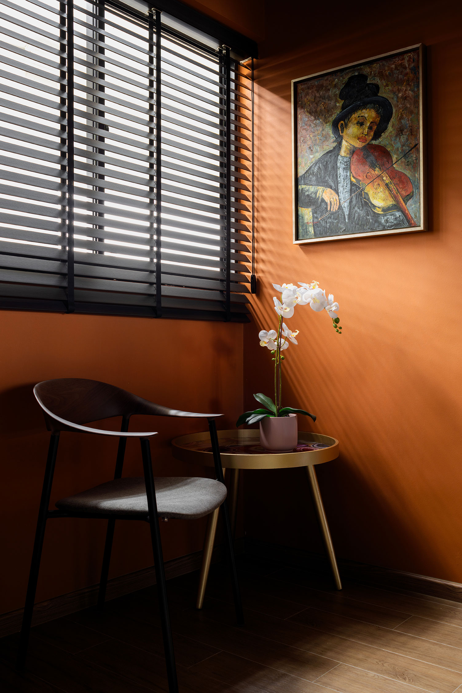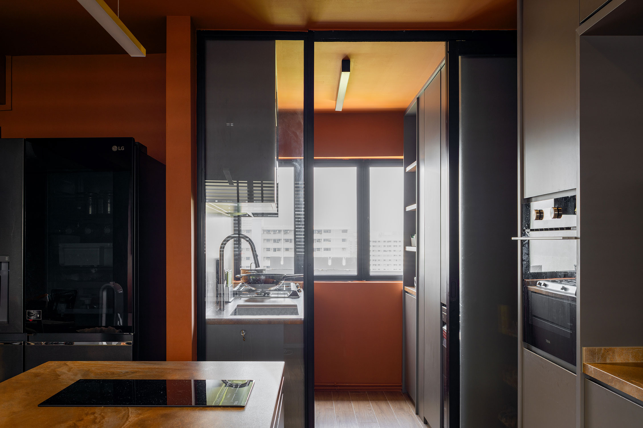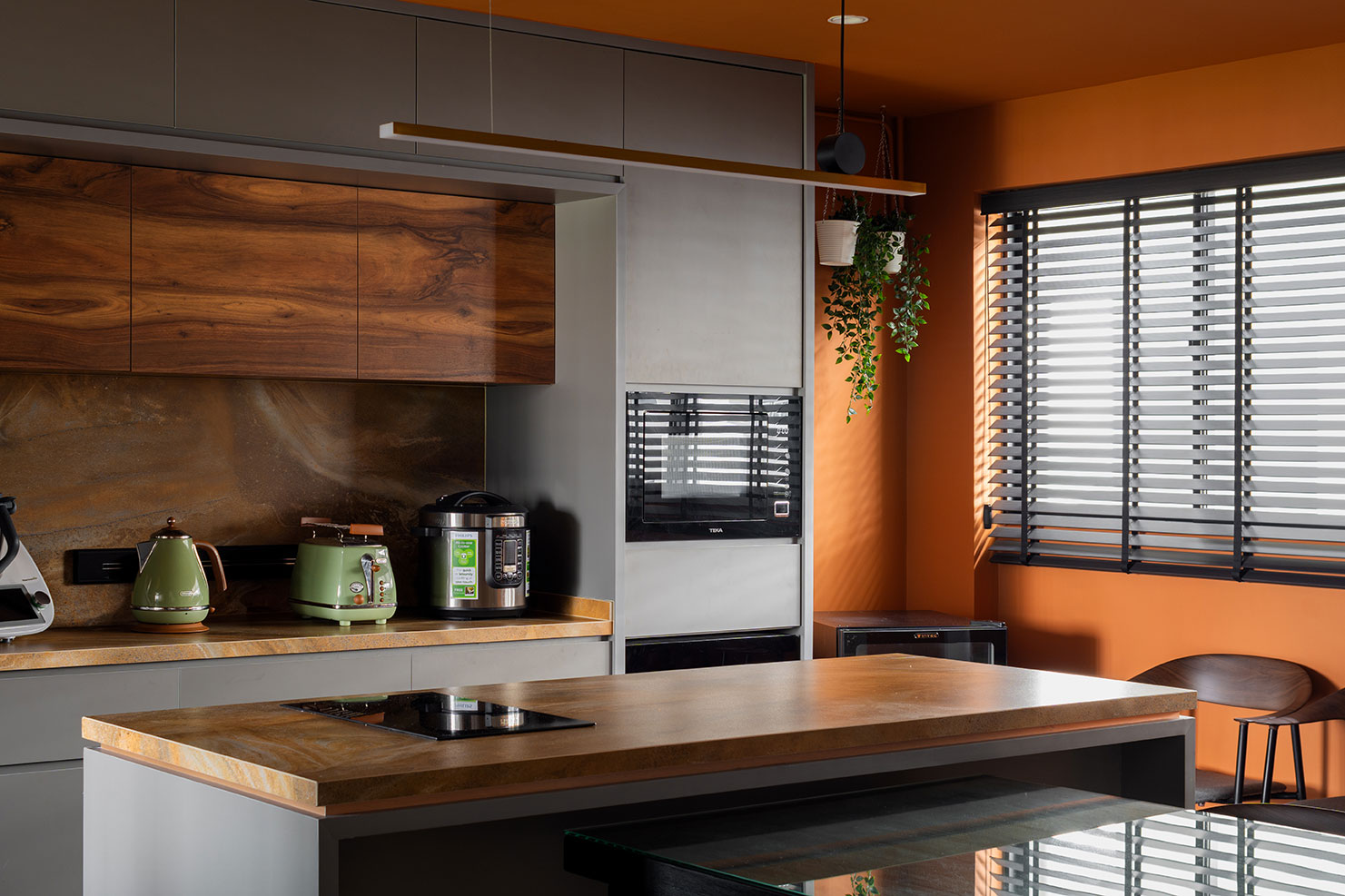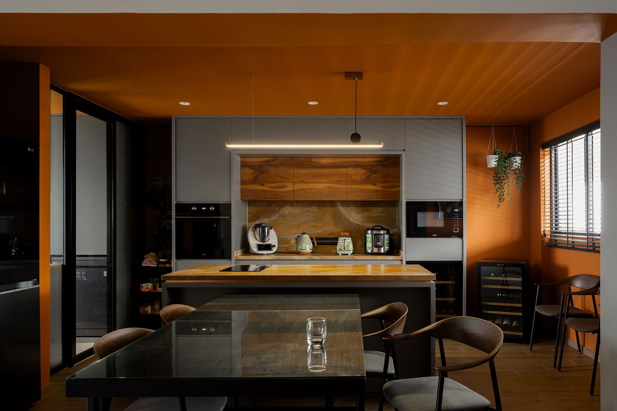 To tie the look together, an orange ceiling introduces a playful yet sophisticated contrast, echoing the tones of the kitchen flooring and infusing the room with a burst of energy and creativity. This unexpected element enhances the overall design, creating a cohesive and visually stimulating environment.